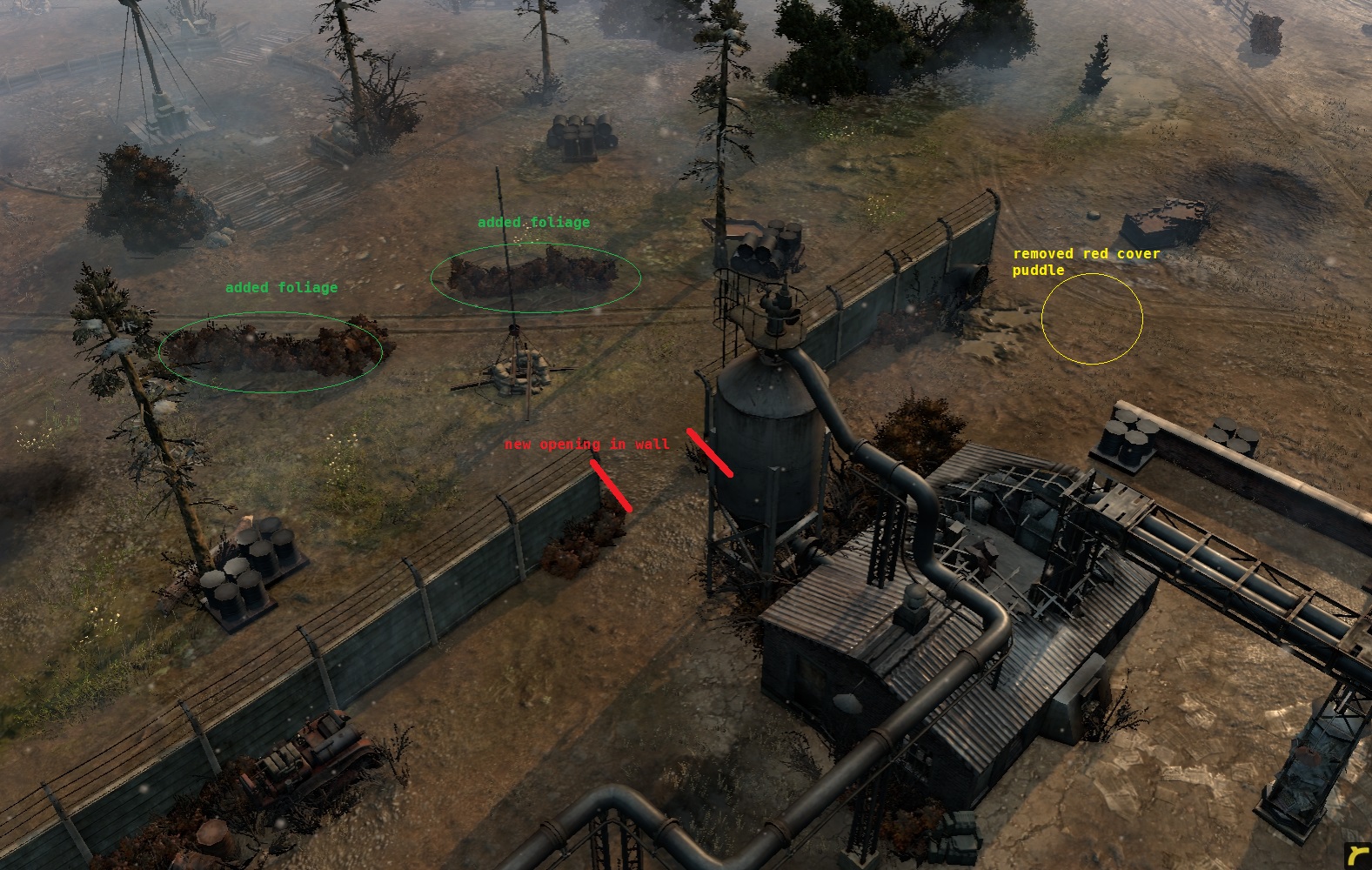 The changes below are meant to further balance the map, improve flow, and create new avenues of approach throughout the central area of the map. Please see below.